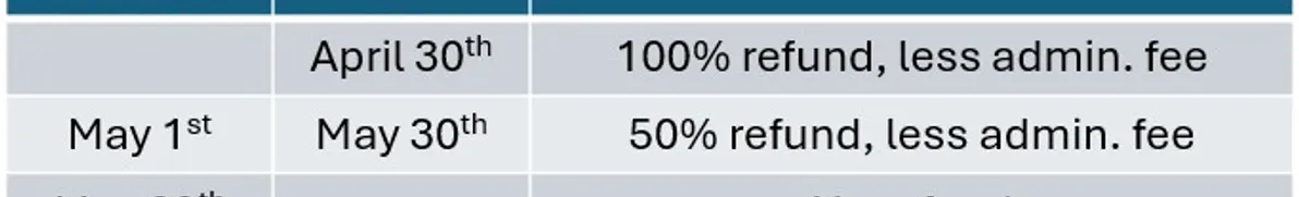 Cancellation notices submitted before 11:59 PM (ET) April 30th are entitled to 100% of refund less the administrative fee.