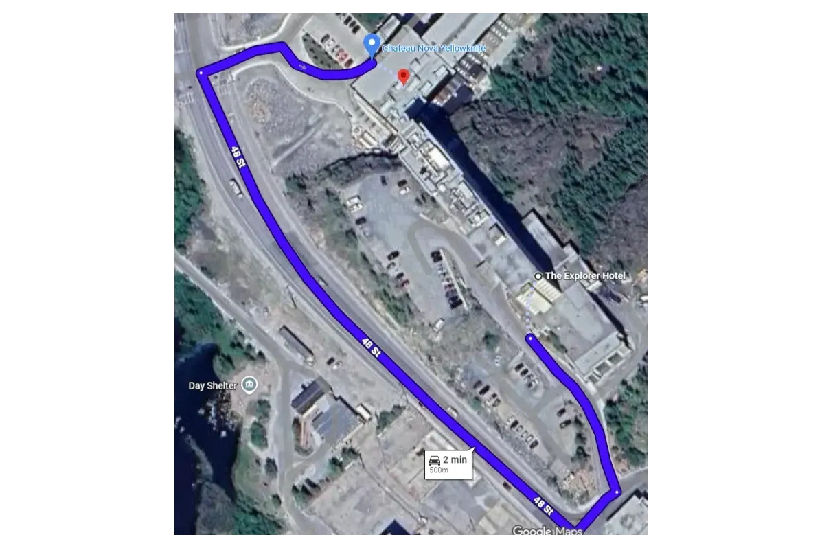 Locals will tell you that nothing in Yellowknife is more than 10 minutes away by car and often on foot. The Chateau Nova and Explorer back onto one another and take 5 minutes or less to walk from one to the other.