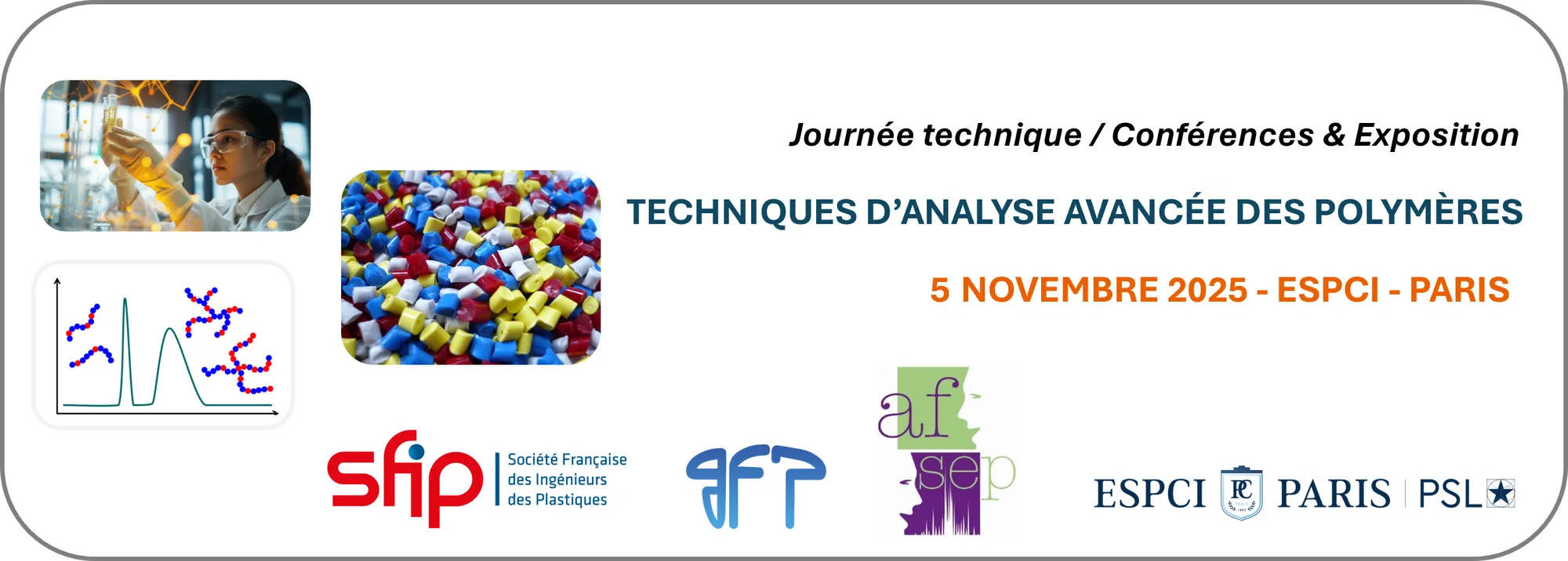SFIP, GFP, AFSEP, and ESPCI with the support of FFM* are organizing a day dedicated to advanced analytical techniques for polymer materials on November 5, 2025, in Paris.