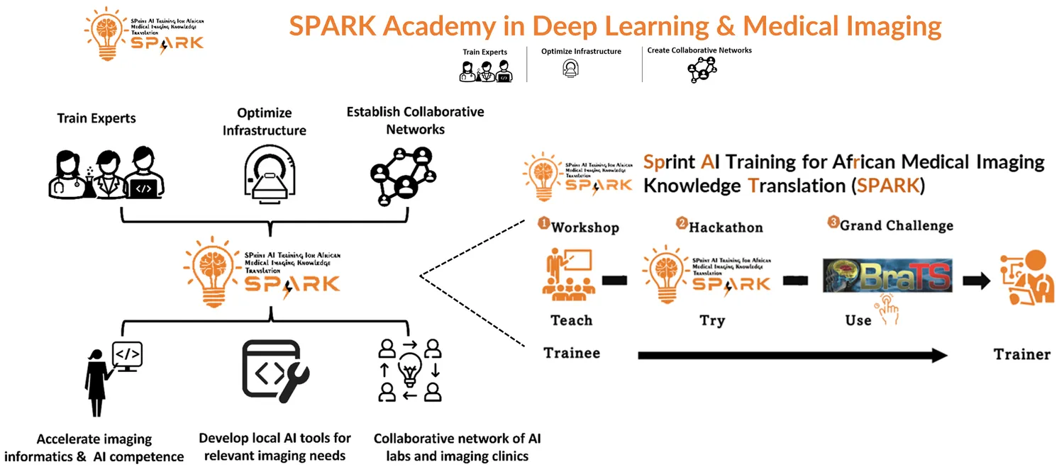 Each SPARK Academy is aimed at a real-world use case and implements collective intelligence built around a networking space to advance AI capacity and rapid implementation in Africa. Our first SPARK Academy endorsed by The Medical Image Computing and Computer Assisted Intervention (MICCAI) Society will train African clinicians and scientists to develop state-of-art AI methods for glioma brain tumor segmentation. The first program brought together oncology, neurology & neurosurgery, radiology, medical physics, biomedical engineering and computer science residents and graduate students from across Africa who co-developed informed AI methods for segmentation of brain tumors into sub-regions on magnetic resonance imaging (MRI) scans.
