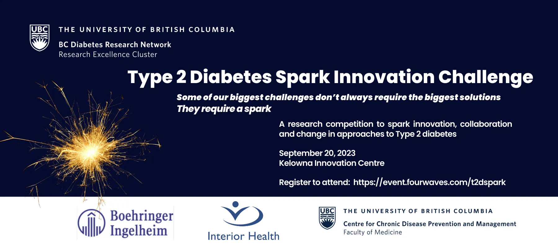 Presented by UBC and supported by Boehringer Ingelheim (BI) the Type 2 Diabetes Spark! is an opportunity for new or existing partners to look at the challenge of type 2 diabetes and design innovative solutions for type 2 diabetes prevention, management, and remission.